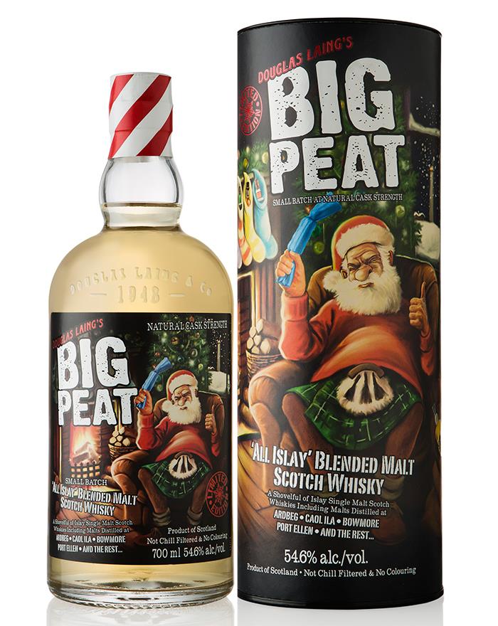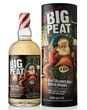 A special Christmas edition of Big Peat Islay blended malt whisky. Big Peat is made by vatting whisky from only Islay distilleries. This special edition has been bottled at Cask Strength and has had its label and presentation tube festively redesigned. A shoveful of Islay Single Malt Scotch Whiskies including malts distilled at Ardbeg, Caol Ila, Bowmore and P ort E llen.Big Peat carries a big peaty (often called "phenolic"), beachy, oceanic, slightly ashy selection of Malts from the island of Islay. Ally these lusty and robust Malts selected for Big Peat with the fact that no chill filtration takes place - a more old fashioned traditional approach - and you will detect a massive amplification of the anticipated sea-fairing qualities on the nose, palate and finish.