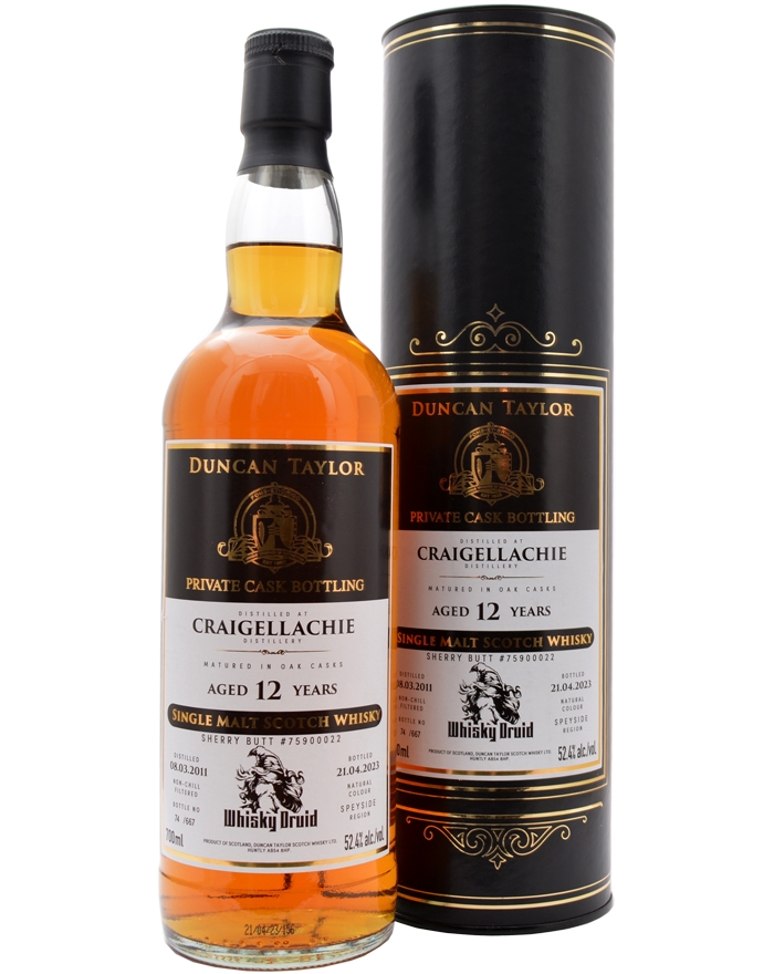 Craigellachie 2011/2023 Duncan Taylor 12-Year Private Cask Bottling is an exclusive single malt whisky from Speyside, bottled at an impressive cask strength of 52.4%. This edition has been matured in a sherry butt cask and is part of a limited series of only 667 bottles, making it a highly sought-after whisky among collectors and enthusiasts.