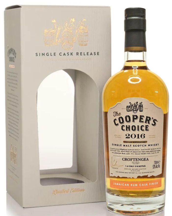 Croftengea 2016 from the Loch Lomond distillery is known as Croftengea. This is a smoky version of Loch Lomond bottled by the whisky merchant Cooper's Choice. It is aged in a used rum cask from Jamaica.