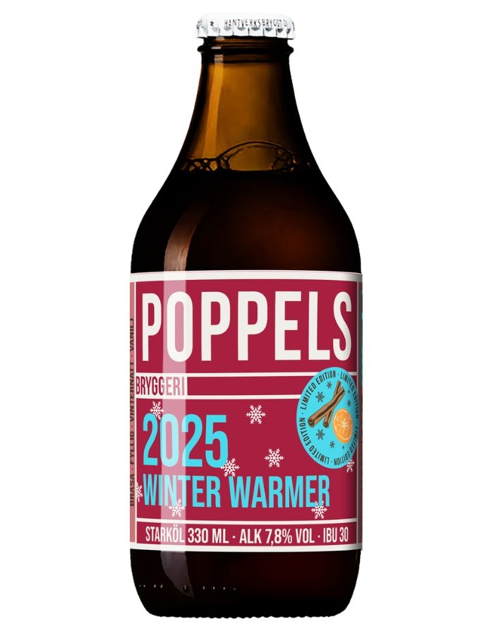 Poppels Winter Warmer 2025 is a bold and spiced Swedish Christmas beer at 7.8%, brewed with orange and cinnamon – perfect for winter meals and quiet moments.